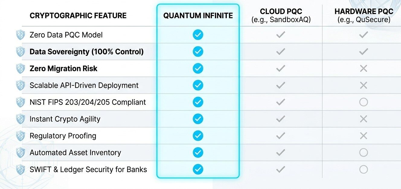 Quantum Infinite: Features the only Zero Data PQC Model where security arrives at your data. Data Sovereignty remains 100% with the client.